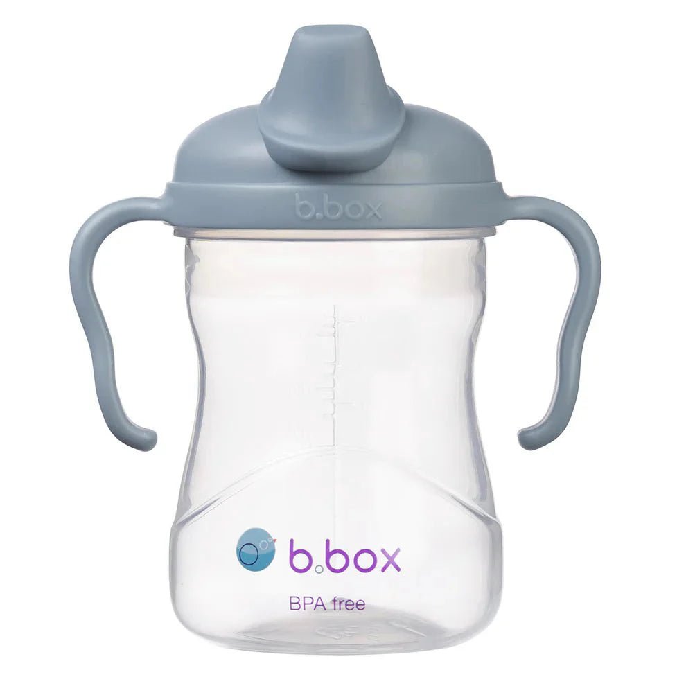 b.box Tutekopp – Blå hjelper babyen å ta steget fra flaske til kopp på en trygg og naturlig måte. Den myke silikon-tuten er skånsom mot barnets gommer og gir en behagelig drikkeopplevelse. De ergonomiske håndtakene er enkle å gripe for små hender, og den smarte designen sørger for sølefri bruk – både hjemme og på tur.