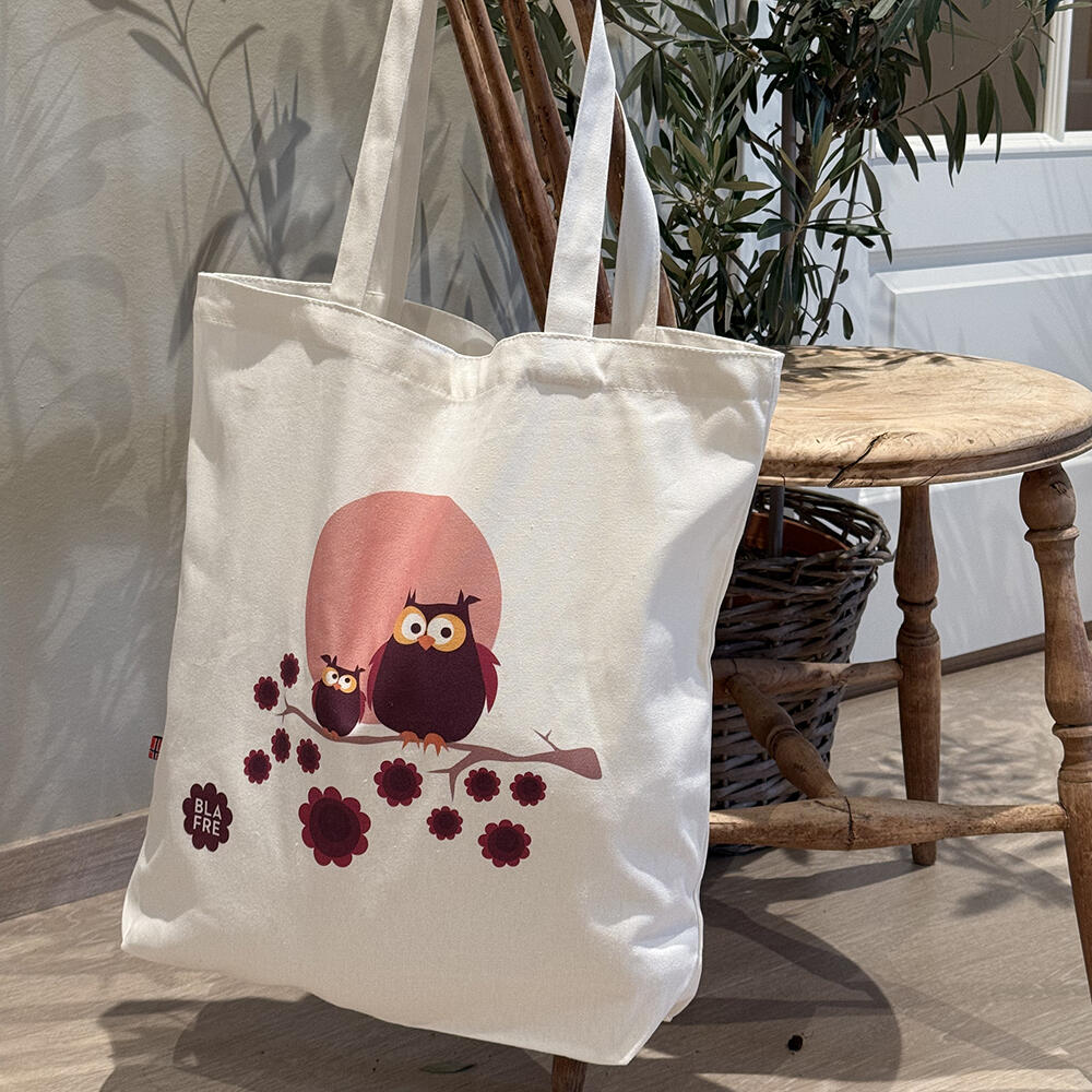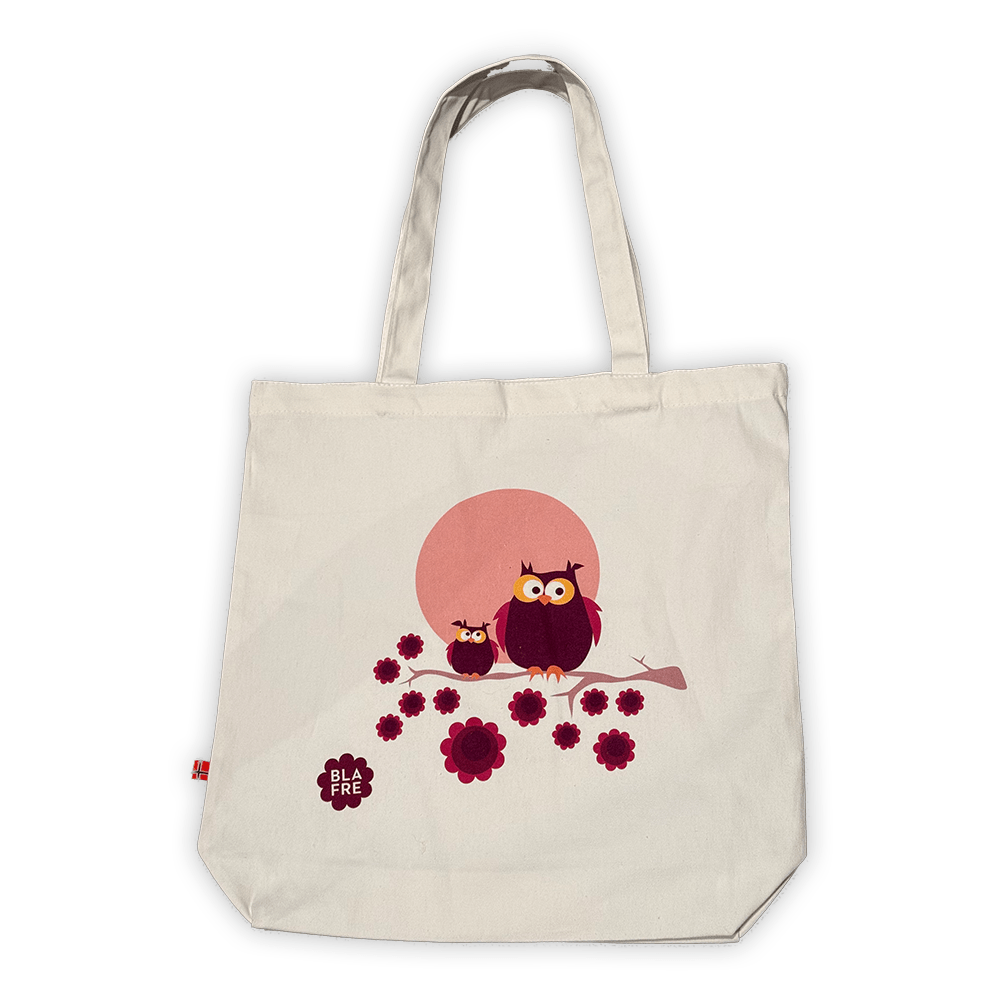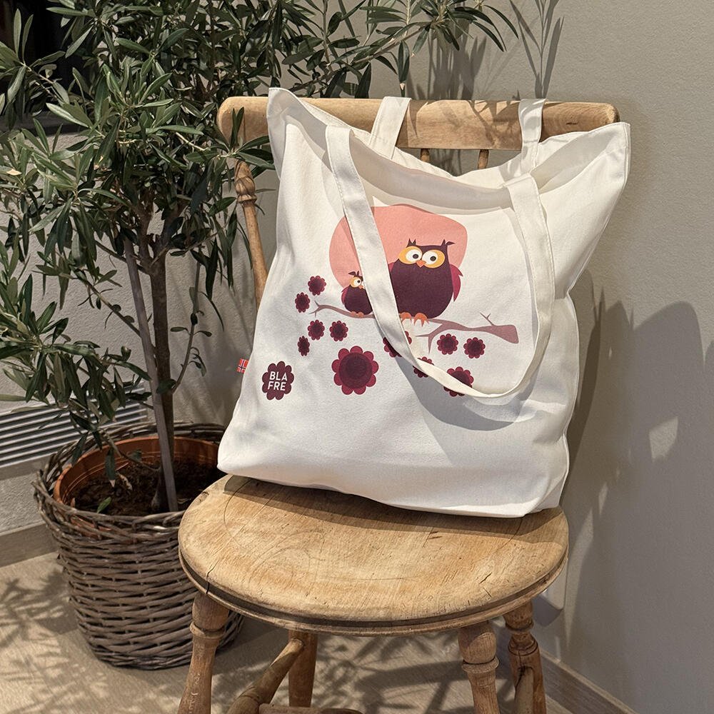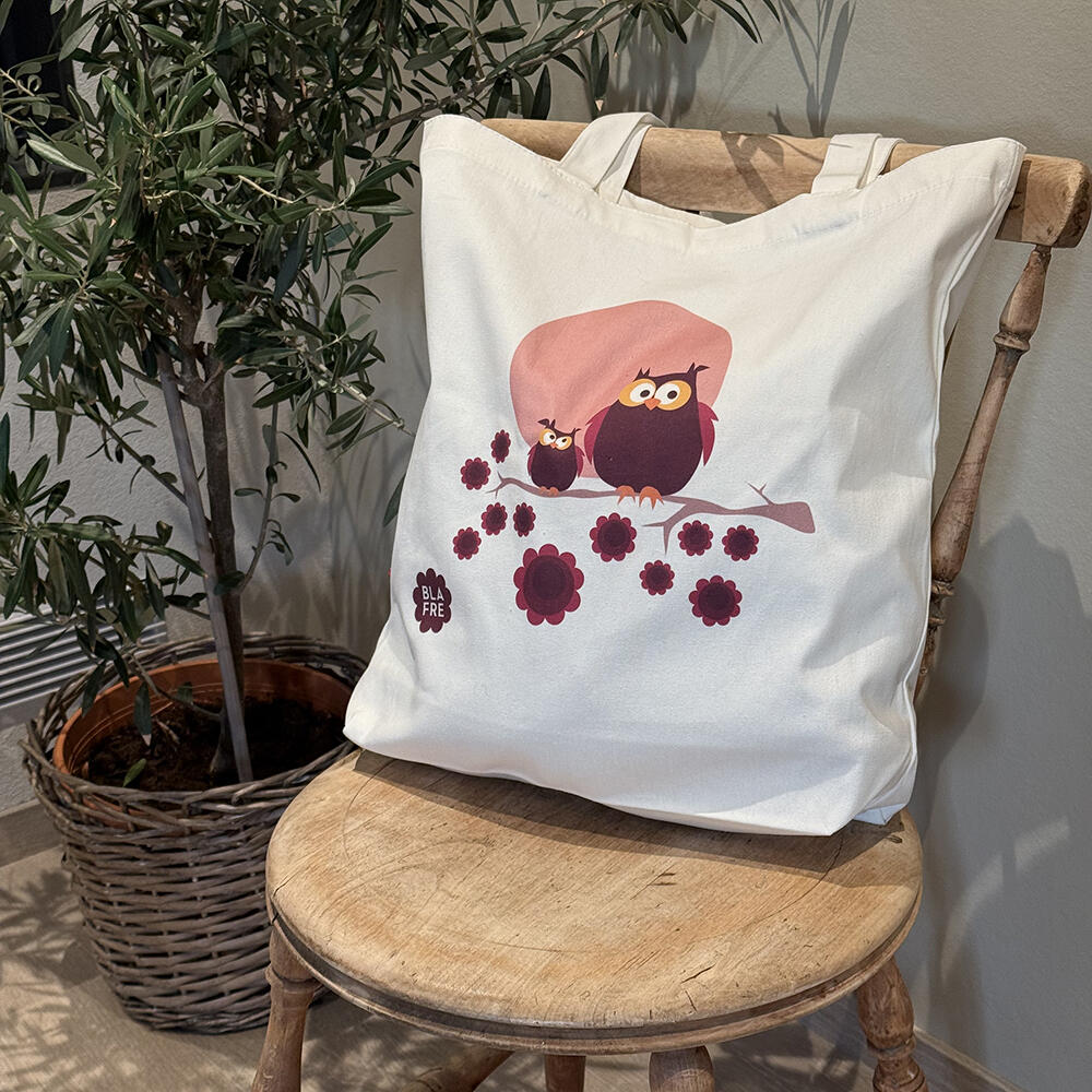 Det nydelige uglemotivet i plommerød og lilla gir et typisk Blafre-preg – retro, fargerikt og fullt av personlighet. En perfekt gaveidé til både barn og voksne som liker gjenbruk og bærekraftige alternativer i hverdagen.