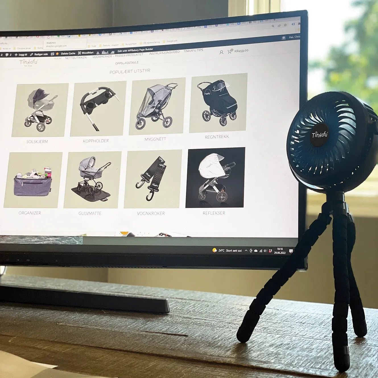 Tinkafu® Oppladbar Vifte er den ultimate løsningen for å holde både baby og foreldre komfortable i sommervarmen. Den kraftige, men stillegående viften har tre justerbare hastigheter, integrert LED-lys og fleksible ben som enkelt festes på alt fra barnevogn og sprinkelseng til kontorpult og telt.